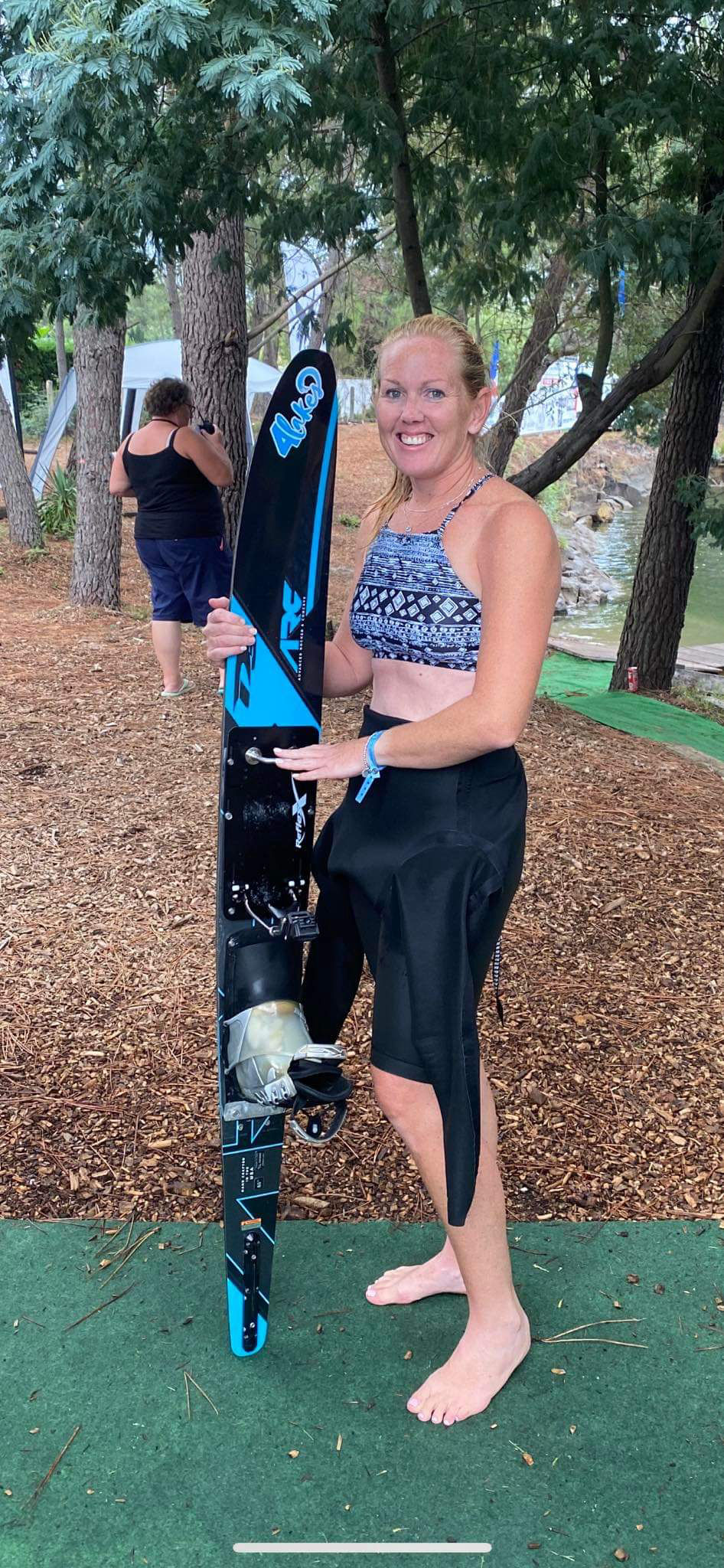 Samantha, skiing in +35 Women Division, participates in all three events of tournament skiing, namely; Slalom, Tricks and Jump. Preliminary rounds were a mixed bag, where she missed out on making finals for tricks, was the last finals qualifier in slalom, and placed 2nd in jump, which in itself was an achievement after taking a crash.